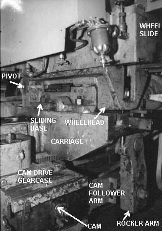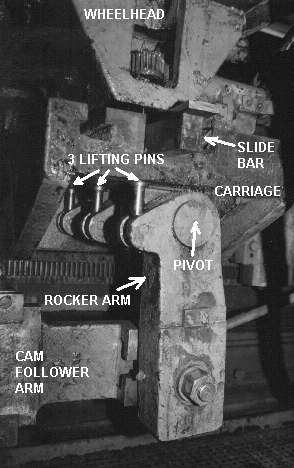 rocker arm portion of the mechanism to actuate the pivoting wheelhead in the