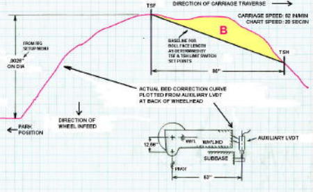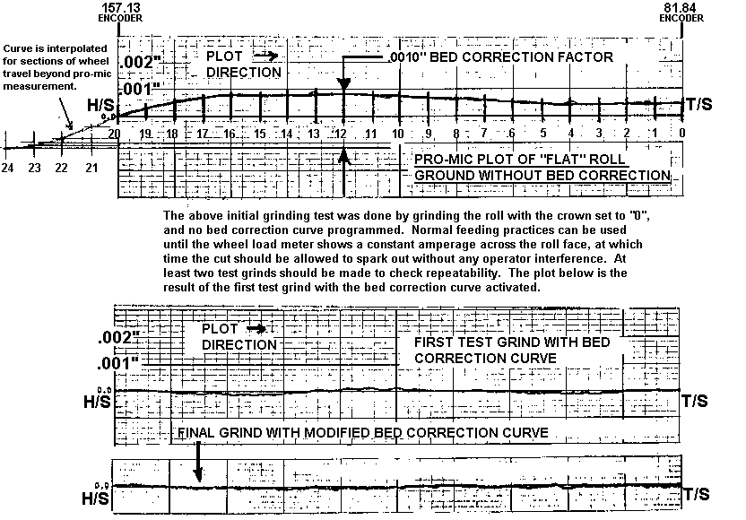 After sufficient testing, the plan is to establish a hard-wired connection between the Pro-Mic computer and the RGB FFG crowner which will essentially automate the complete bed correction process. This will then be a form of true "adaptive" control, since the grinder will always be programming itself to continuously optimize the roll shapes, without operator intervention. This simplified form of adaptive control is a much less expensive option compared with the newer style CNC grinders with in-process calipers. |