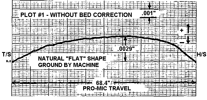 RGB Engineering and Pro-Mic Corporation are working together to "automate" this bed correction process. This is an ongoing development project in an Aluminum mill roll shop, which has a RGB crowner installed on a Cincinnati TT grinder and a Pro-Mic with modified software . After each final roll shape is skated, the operator initiates a download of the data to a holding file, along with a few key parameters (target crown and end stop settings). After an extended period, these accumulated roll shapes are sent to RGB Engineering for processing in a data base program. Each plot is analyzed and compared to the true target shape, resulting in a "deviation" curve. These are averaged and further processed to produce the final bed correction curve, which is e-mailed to the customer and then installed in the FFG replacing the original bed curve.