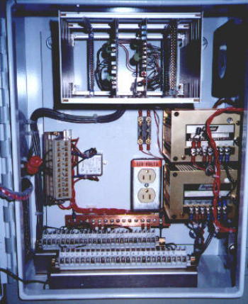 The SCA control station is a 20" high x 16" wide x 10" deep 14 gauge Nema-12 enclosure, and is usually mounted on the floor for traveling table grinders, and on the carriage for traveling carriage grinders. It typically contains the crowner summing board, LVDT conditioner board, power supplies, indicating lights, digital volt meter, cables, and other miscellaneous items. The cabinet is equipped with a circulating fan and filtered louvers for cooling. Terminal strips are provided for all external connections. Auxiliary power outlets are standard along with an EMI filter and circuit breaker.